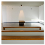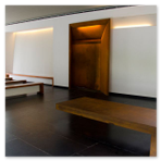 Nella sala commemorativa il corteo si ricongiunge al defunto, per l'ultimo saluto prima del rito della cremazione. Di fronte al vestibolo di ingresso un patio, dove la presenza di una pianta di arancio, rimanda ad un contatto con l'esterno attraverso una delicata luce zenitale modulata da un sistema di lame verticali. Mentre al sorgere del sole, un basso taglio orizzontale sulla parete a nord est della sala, illumina il podio in sul quale verrà deposto il feretro.